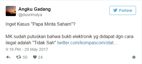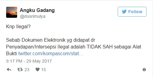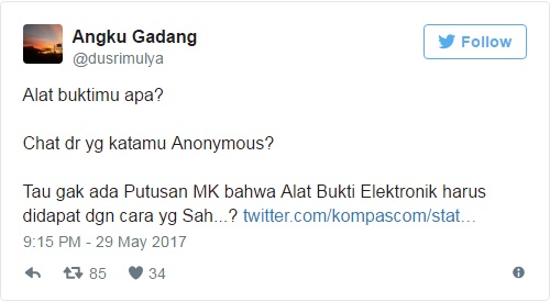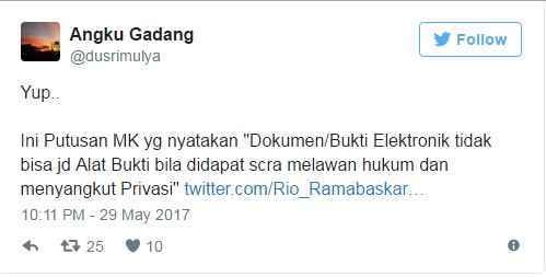 Intinya: Putusan MK September 2016, memutuskan bahwa Dokumen Elektronik yg bersifat Privat TIDAK DAPAT JADI BUKTI bila Didapat Tanpa Hak https://t.co/SAJXldo3b0